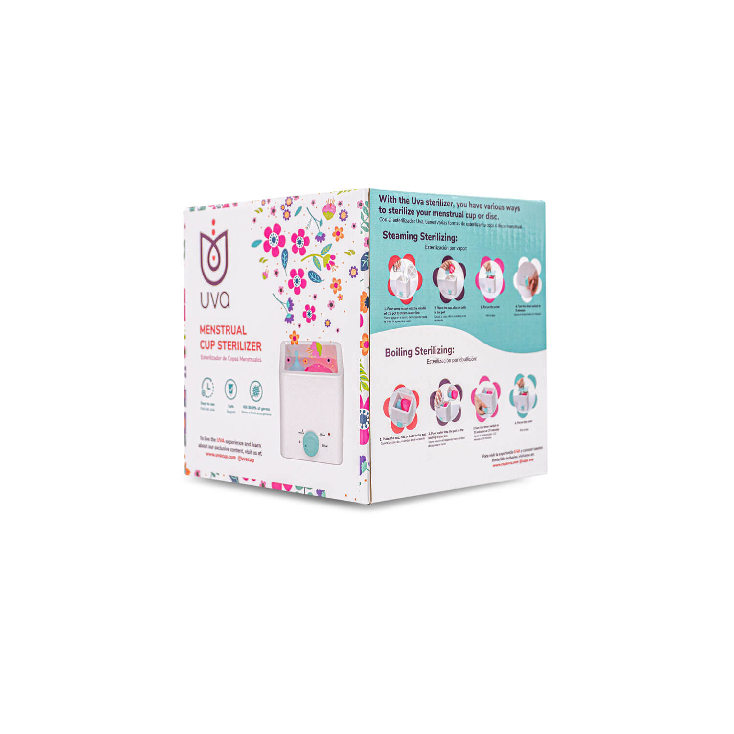 Gracias a su sistema de esterilización por vapor o por ebullición, elimina hasta el 99.9% de los gérmenes, ayudando a prevenir infecciones y malos olores, mientras protege el material de tu copa o disco menstrual.
